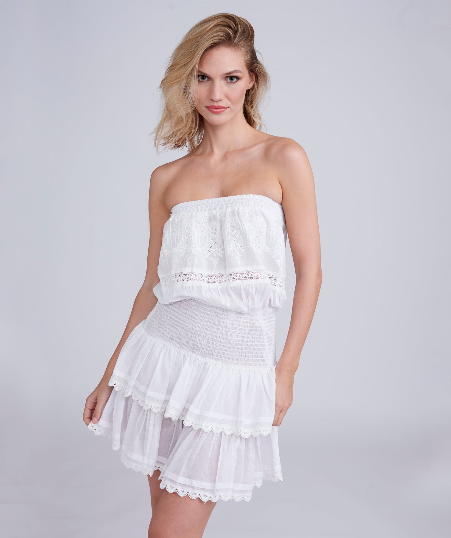 Step out in style with our Toledo Dress in crisp White. This versatile beach dress is crafted from cooling cotton fabric, adorned with feminine lace detailing for a touch of elegance. The bandeau elasticated design and midi length make it the perfect blend of comfort and style for any summer outing.