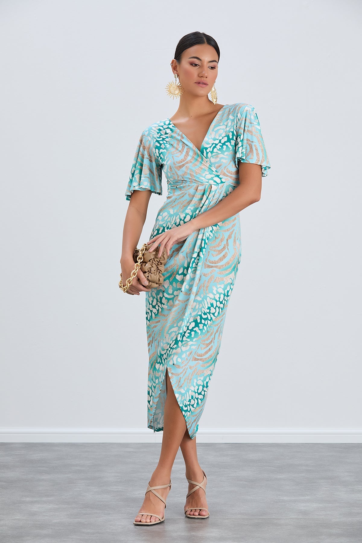 Make a statement with our Flirty Flutter Sleeve Wrap Midi Dress in refreshing mint animal print. The chic wrap design flatters your figure, while the flutter sleeves give a soft, feminine touch. This playful yet sophisticated dress is perfect for adding a pop of color to your wardrobe, blending comfort with standout style.