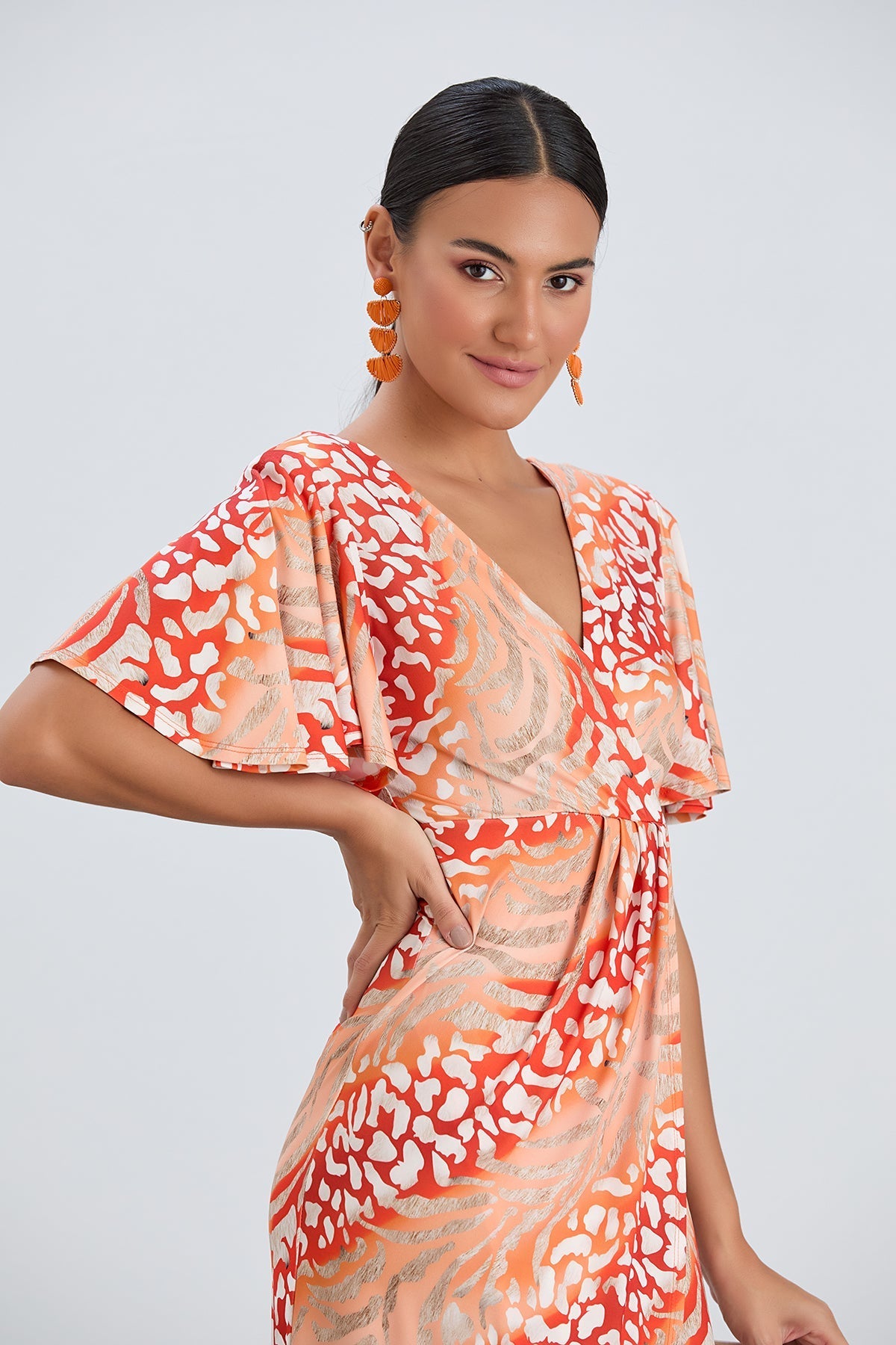 Flirty Flutter Sleeve Wrap Midi Dress in Orange Animal Print - jqwholesale.com