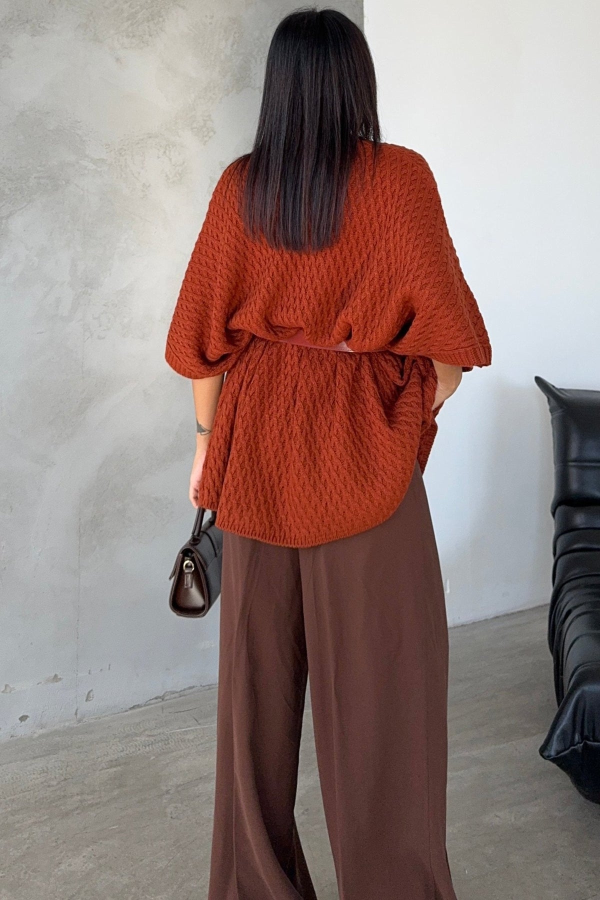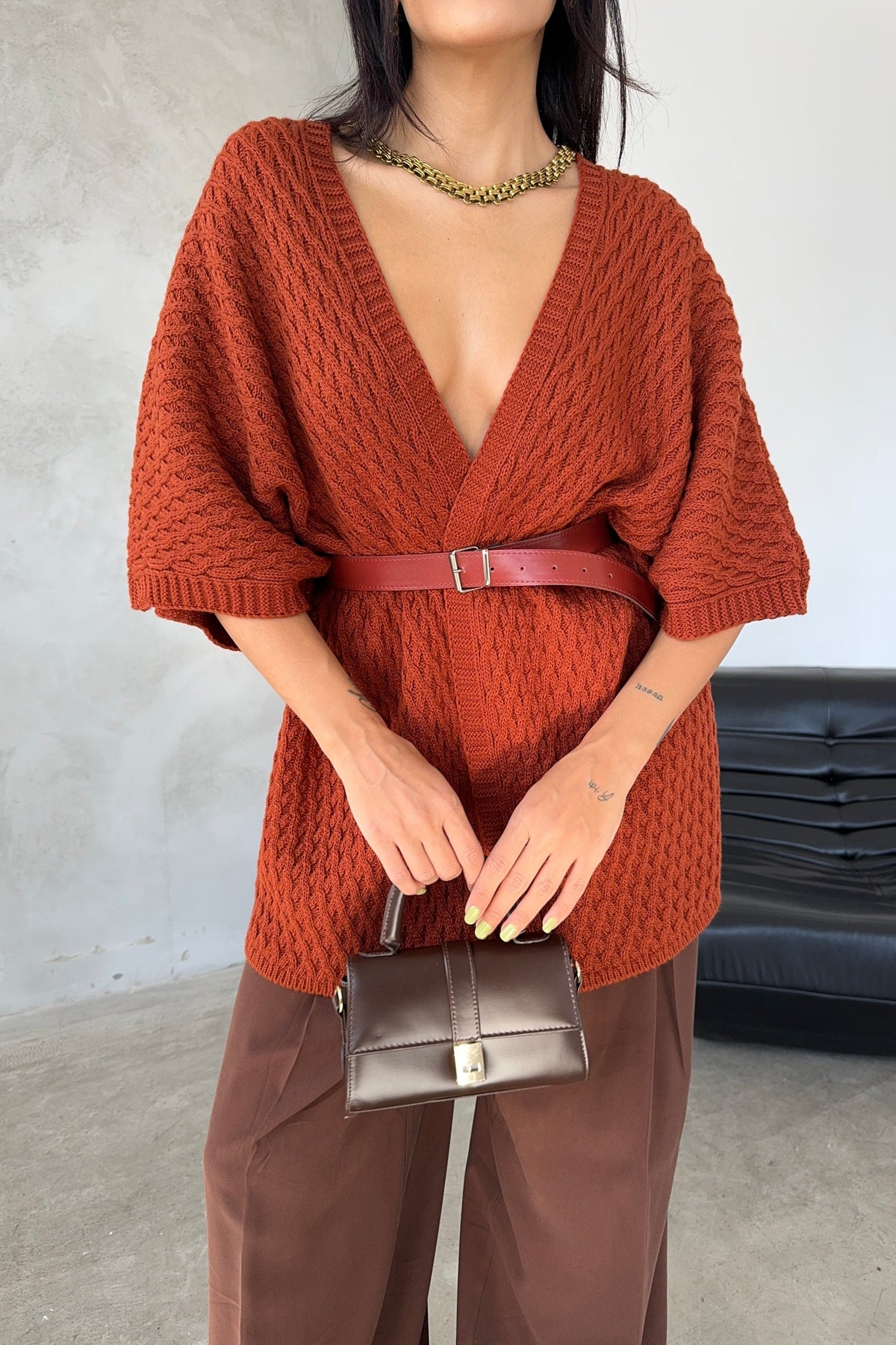 Wrap up your seasonal collection with our Short Sleeve Wrap Cardigan in a rich rust red—perfect for cozy, stylish layering. This piece combines intricate knitwork with a relaxed, easy-to-wear silhouette that appeals to any customer looking for both comfort and style.