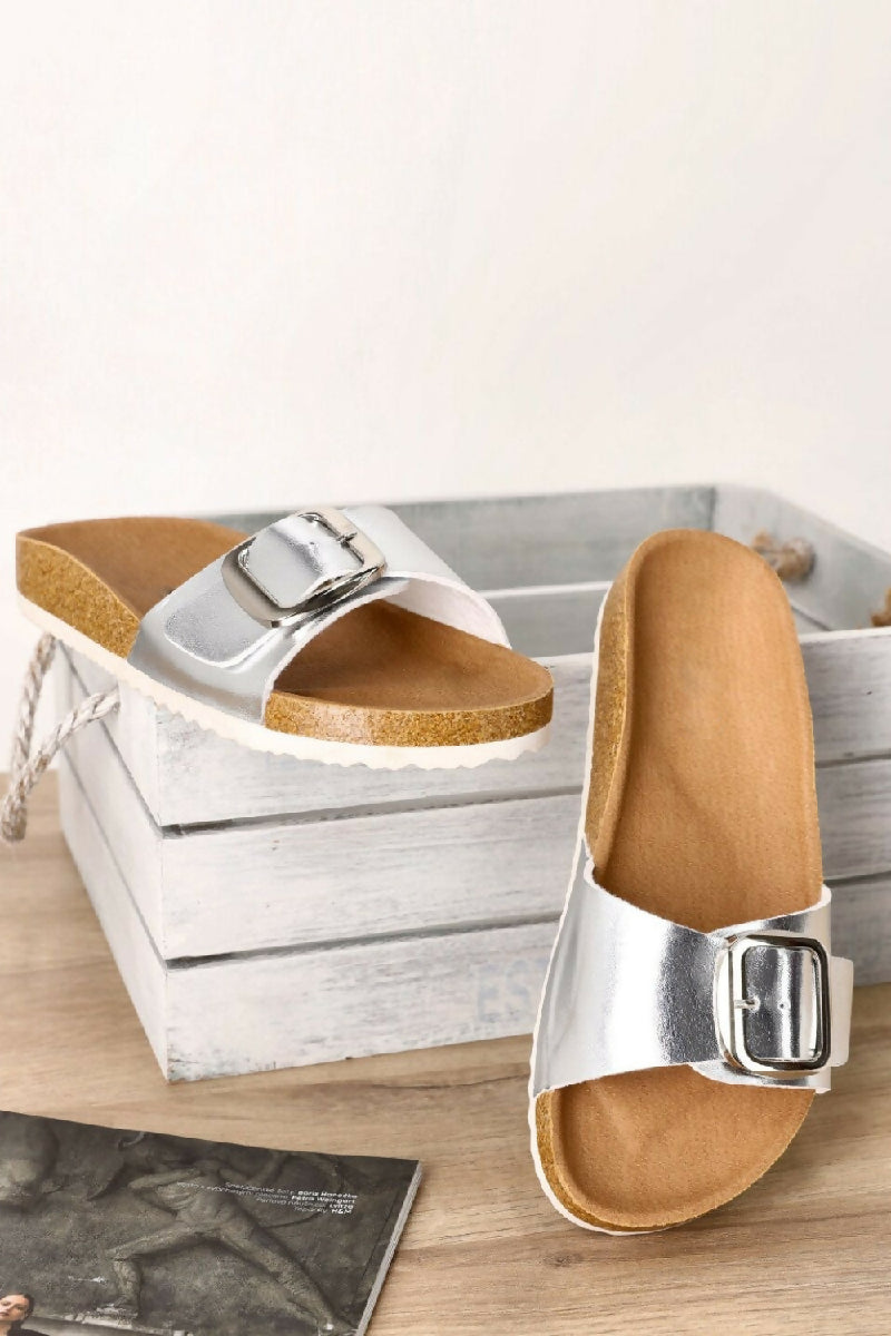 SILVER OVERSIZED BUCKLE SOFT FOOTBED SANDALS (PACK OF 12 PAIRS UK3-UK8)
