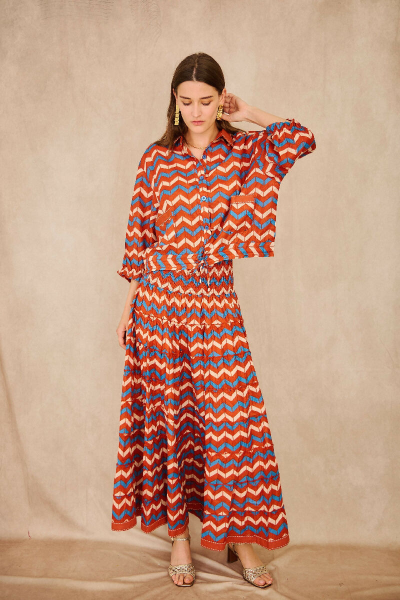 Discover this long cotton skirt, it has a high waist with smocked details, as well as harmonious gathers distributed along the entire length.
