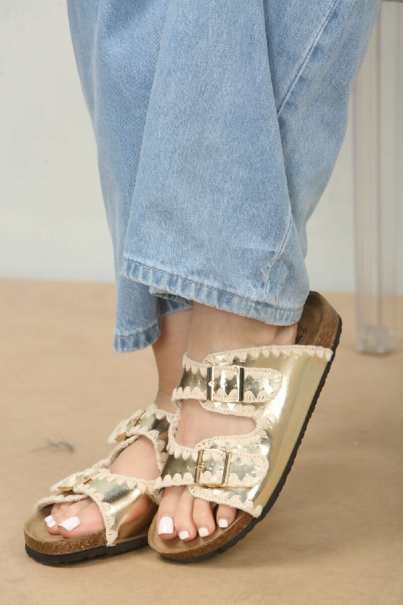 CONTRAST STITCH GOLD SOFT FOOTBED SUMMER FLAT SLIDERS SANDALS (PACK OF 12 PAIRS UK3-UK8)