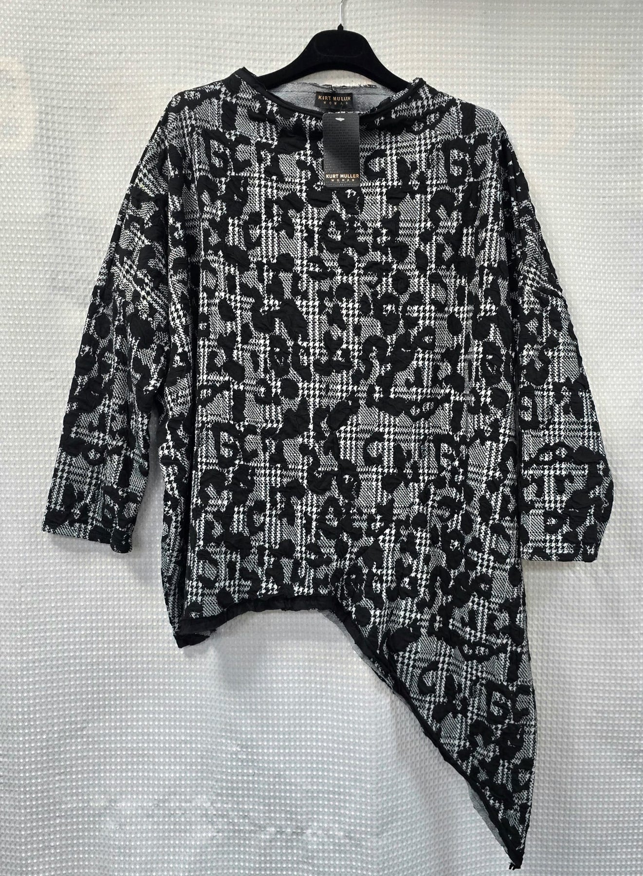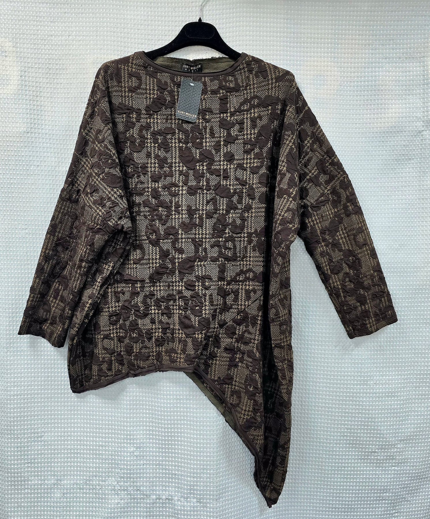 Textured asymmetric long sleeve top.  Stylish and trendy. Lace hem