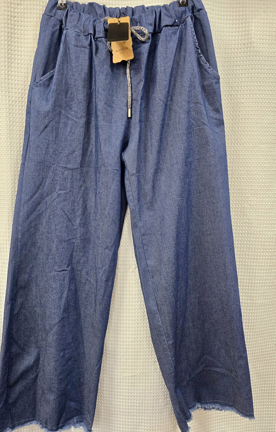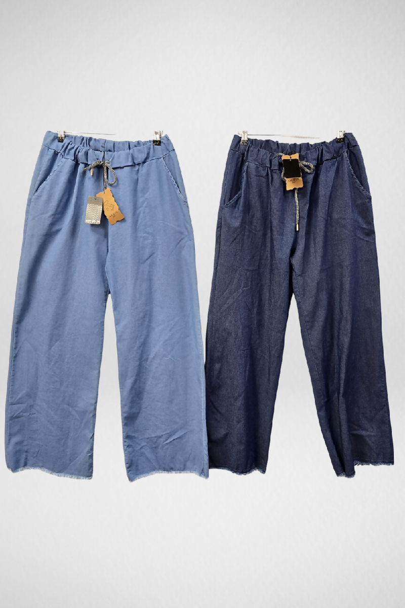Upgrade your denim offering with these stylish Wide Leg Frayed Hem Denim Magic Trousers — a versatile silhouette with an easy fit. Crafted in soft Italian bi-stretch denim, these trousers feature a flattering wide leg, trendy frayed hem, and adjustable tie waist for comfort and shape. Perfect for casual spring/summer styling with trainers or sandals.