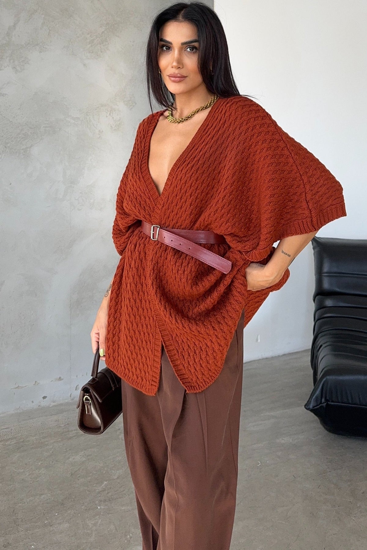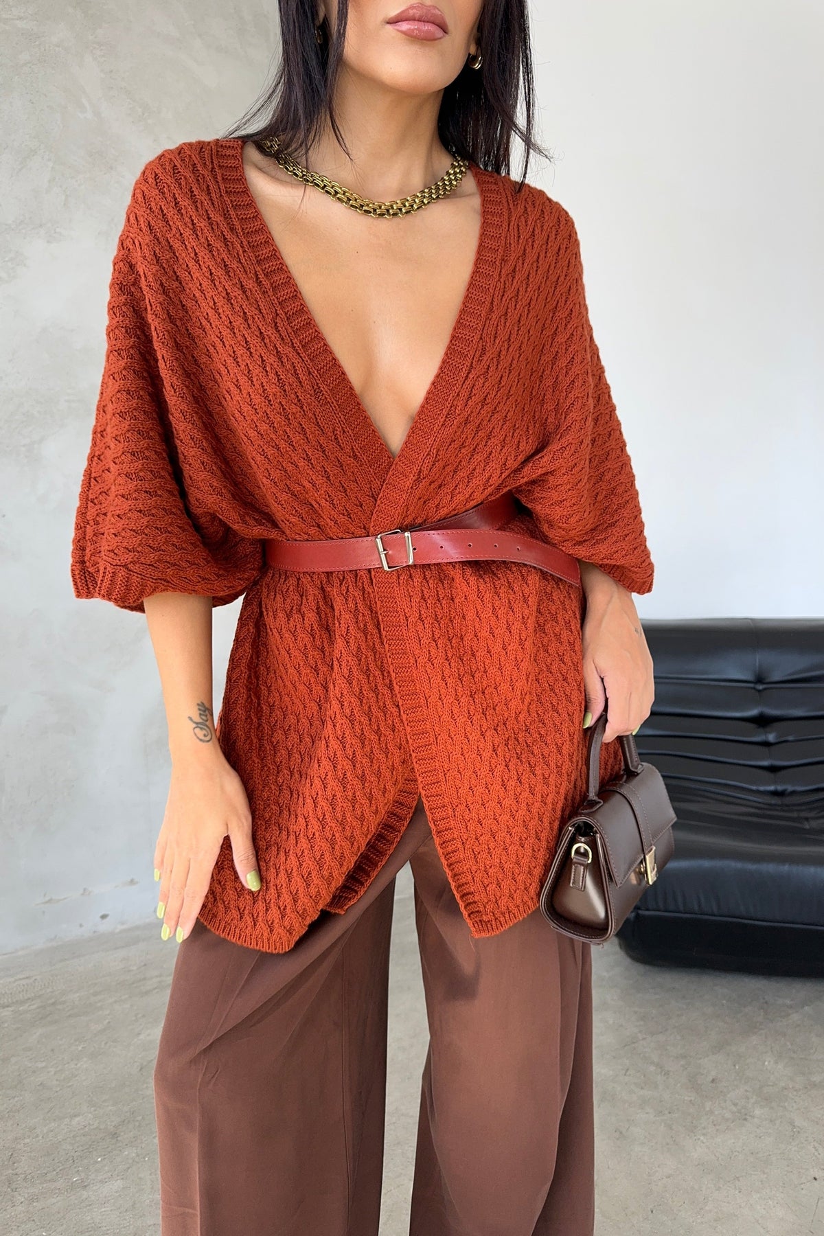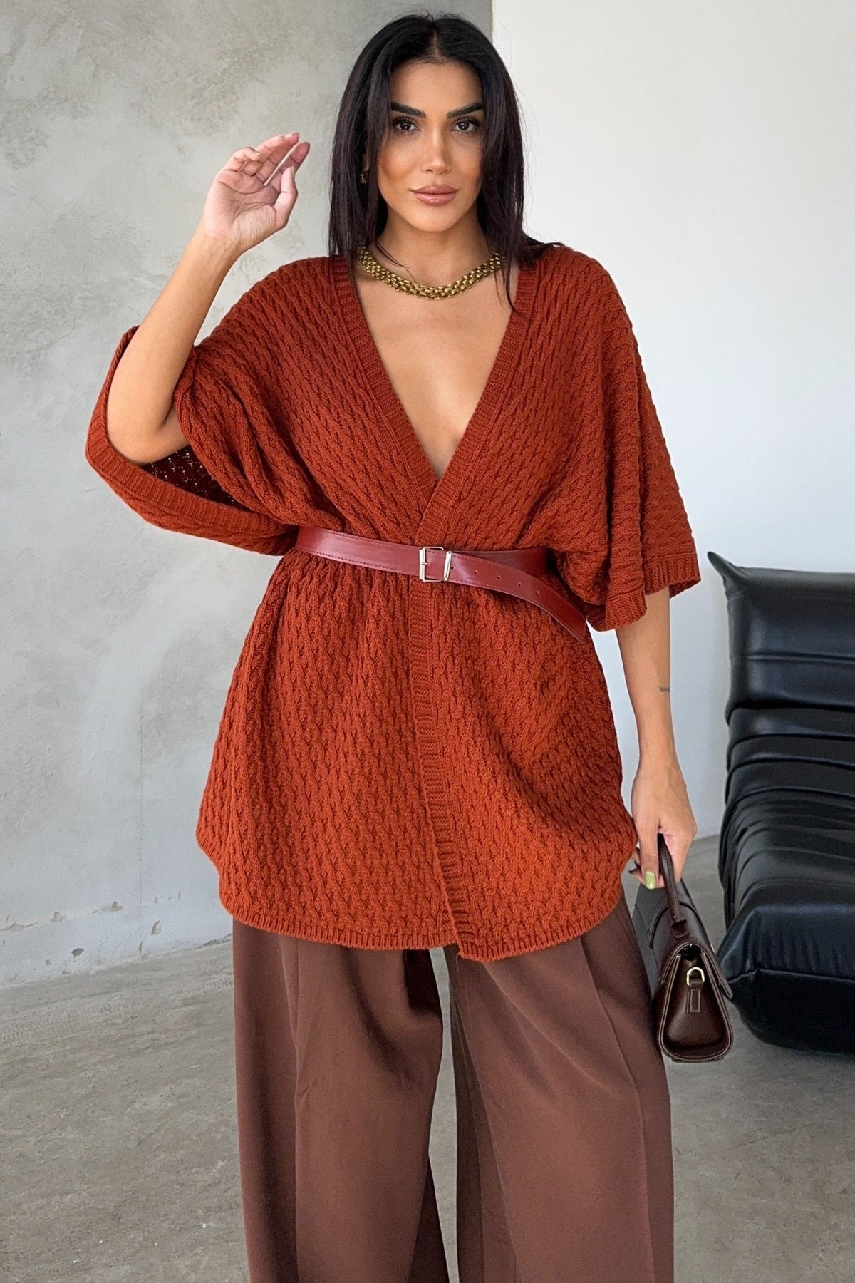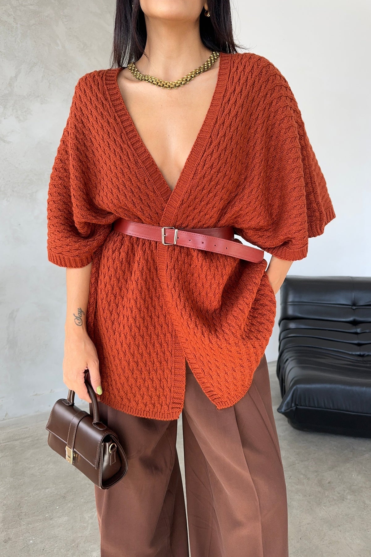 Wrap up your seasonal collection with our Short Sleeve Wrap Cardigan in a rich rust red—perfect for cozy, stylish layering. This piece combines intricate knitwork with a relaxed, easy-to-wear silhouette that appeals to any customer looking for both comfort and style.